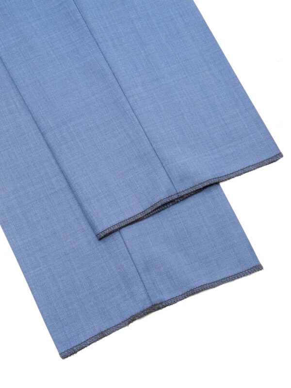 Spodnie w kolorze błękitnym. Wykonane z tkaniny od renomowanego producenta tkanin Loro Piana.  Spodnie z dwiema skośnymi kieszeniami z przodu oraz kieszeniami dwuwypustkowymi z tyłu. Spodnie posiadają wyższy stan, dwie pojedyncze zakładki, boczne regulatory na wysokości pasa oraz guziki do przypięcia szelek. Dół nogawek zakończony jest mankietami o szerokości 4 cm.
