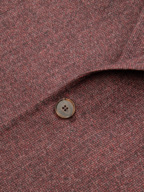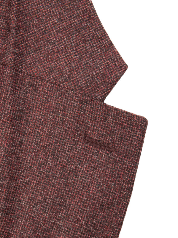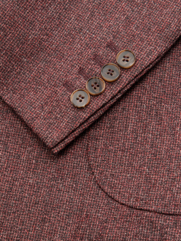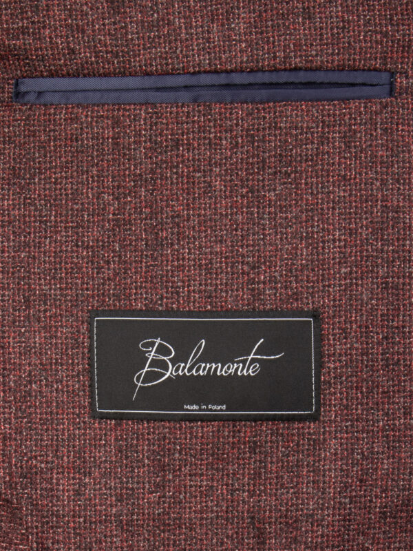 Sportowa marynarka w kolorze bordowym. Wykonana z tkaniny od renomowanego producenta tkanin Fratelli Tallia di Delfino. Kieszenie nakładane, guziki w odcieniach brązu. Klapy otwarte, kieszonka piersiowa zaokrąglona (barchetta), dwa rozcięcia z tyłu. Marynarka o niezwykle lekkiej konstrukcji bez wypełnienia w ramionach. Metoda half-canvas sprawi, że marynarka będzie idealnie się układać.