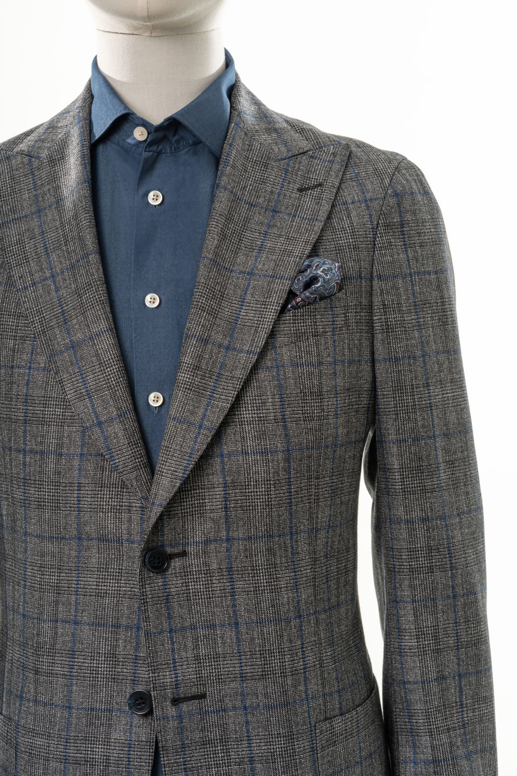 Szara marynarka PARIS wykonana w 100% z wełny. Marynarka jednorzędowa z lekkim wypełnieniem ramion. Szerokie, zamknięte wyłogi, brustasza cięta po łuku i kontrastowe guziki sprawiają, że jest to niezwykle uniwersalna marynarka. Wykonana w konstrukcji half-canvas zapewni idealny komfort w użytkowaniu.